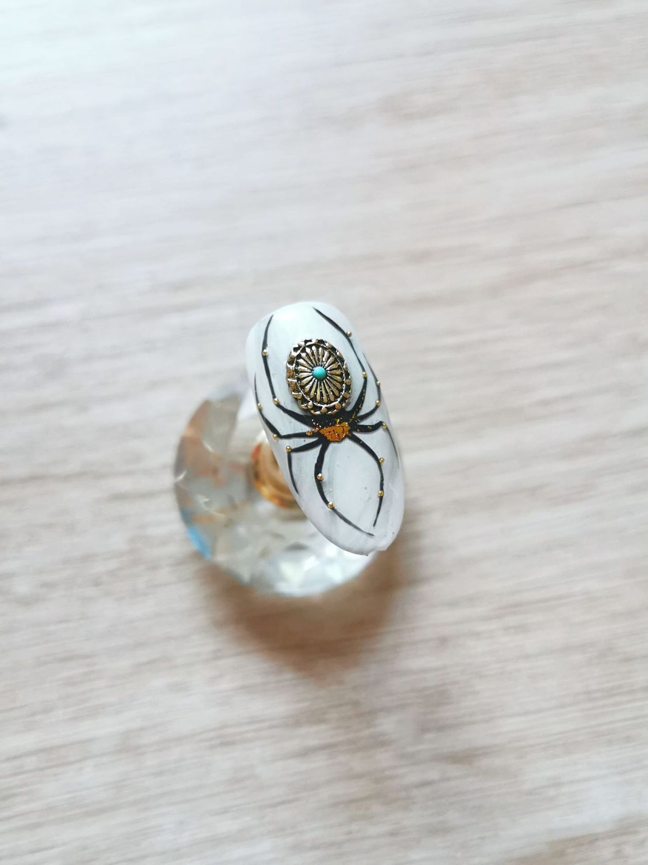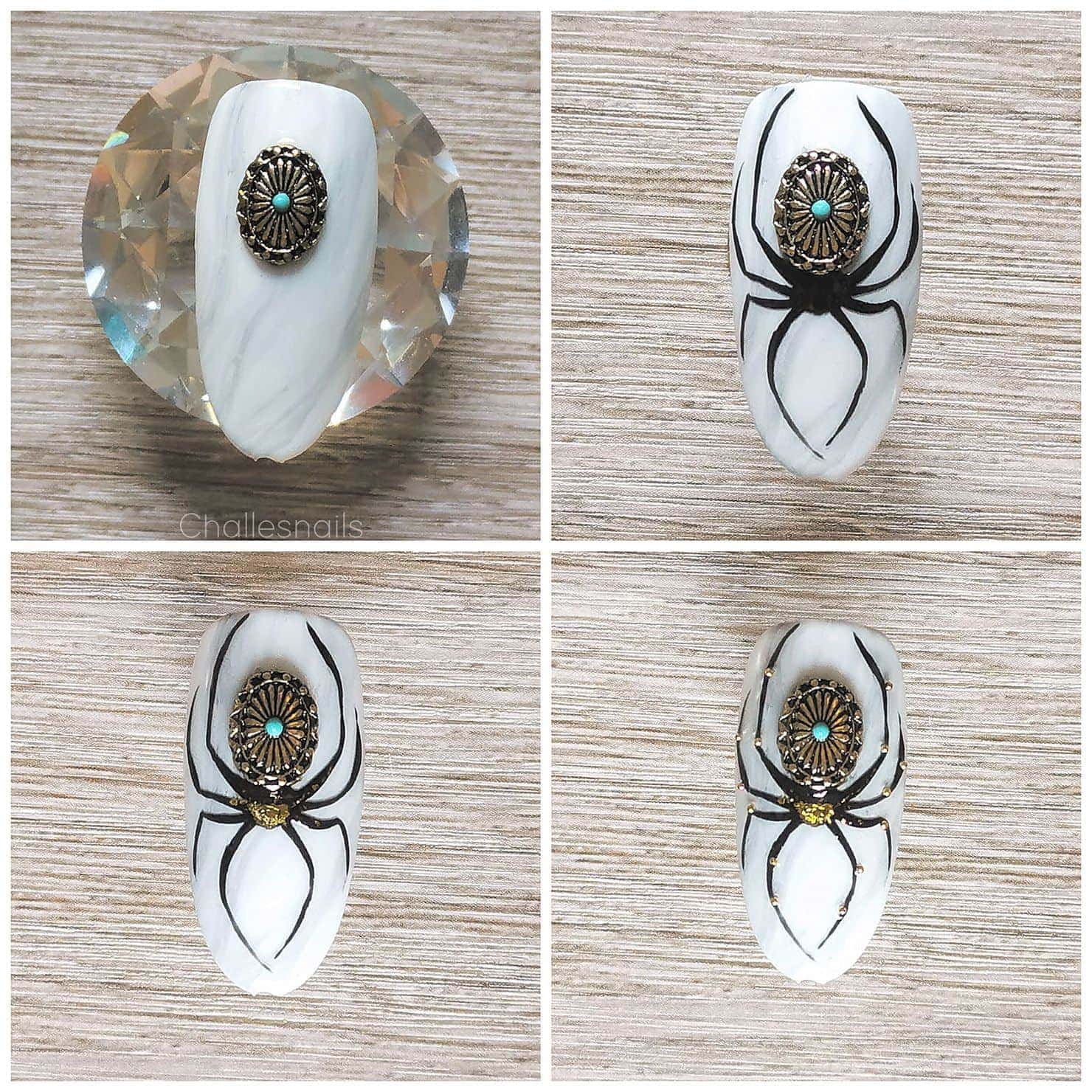 Det här är en super enkel design! Måla din nagel I den bakgrund du vill ha. Jag valde att göra en vit marble för lite extra design. Eftersom jag visste att jag ville ha en av dessa fantastiska nagelsmycken som “rumpa” på min spindel så fäste jag först den i nageln med hjälp av byggele, härdade den och sedan kunde jag fritt måla resten av spindeln runt smycket. Jag använder penslarna Swirly och Stripy för att måla kroppen och benen. Jag tycker inte att benen behöver vara helt symmetriska så oroa dej inte för att måla som helt perfekta, det skapar ett mer levande intryck. Efter att jag har målat färdigt spindeln så härdar jag den och fäster guldfolie där jag vill ha den. För det lilla extra så täcker jag nageln med en rinnig byggele och lägger på lite extra gele över benen, sedan placerar jag guldbeads undefär där jag tänker att lederna sitter. Sedan är vi färdig med vår lilla fantasispindel!